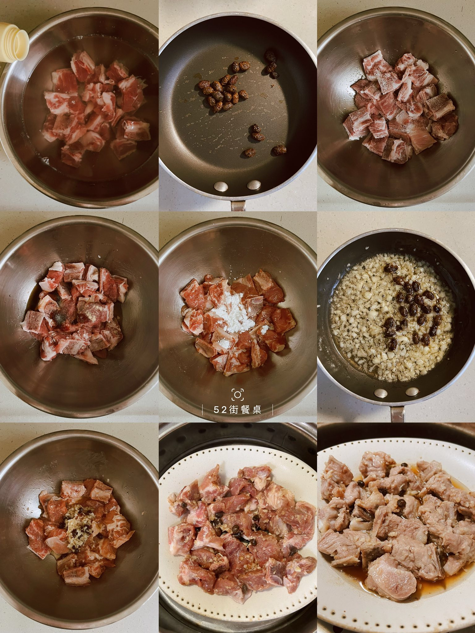 1. 排骨切成一口大小,加醋及飲用水泡20分鐘,時間到將水倒掉,再用飲用水沖洗一遍。