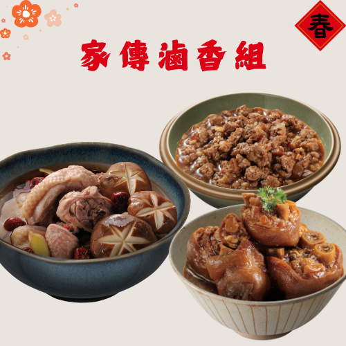 組合內含:古鎮滷豬腳450g*1+古鎮滷肉燥300g*1+香菇雞湯1000g*1