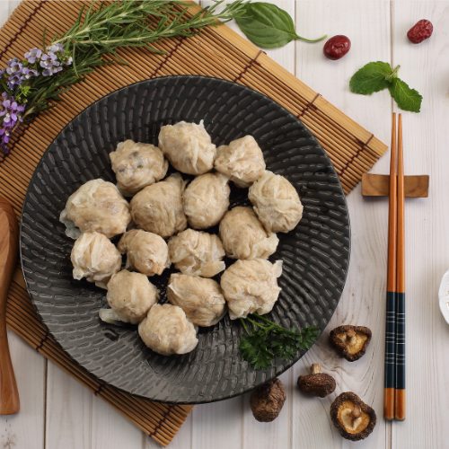 包裹捶打過的香草豬後腿肉餡與香菇、銀耳,