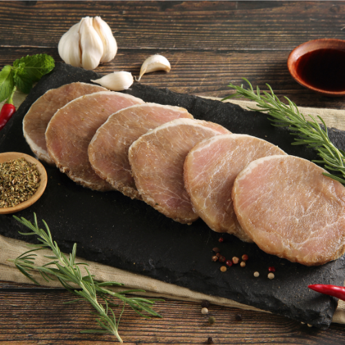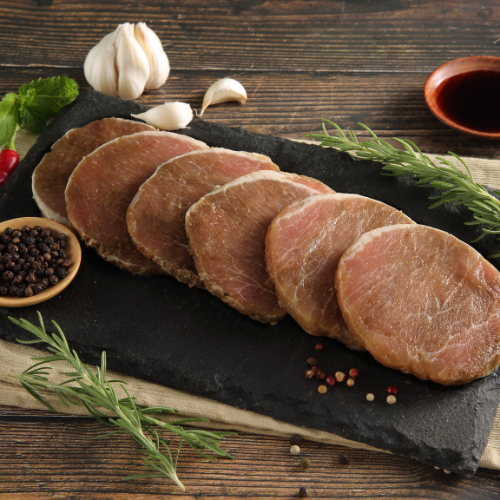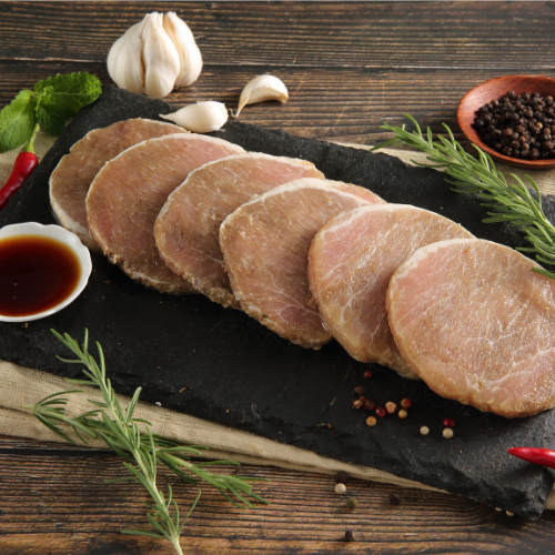 取自香草豬原塊里肌肉,以100%天然香料經機器真空揉捏醃製,口感更軟嫩,簡單乾煎即可上菜。
