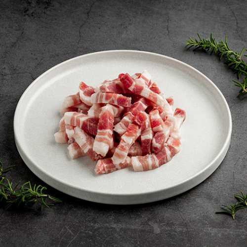 去皮五花切成1×1公分肉絲,油脂分布均勻、炒菜提香超到味!